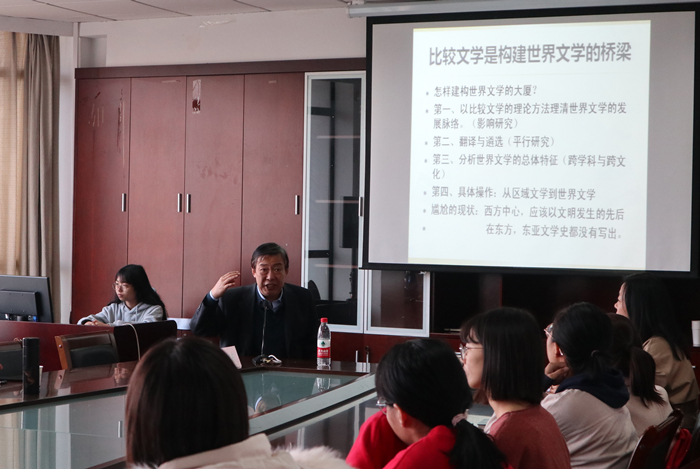 2019年11月20日下午,中国人民大学文学院杰出学者特聘教授、长江学者高旭东教授受邀来皇冠体育 开展以“从理论与个案对世界文学的重新审视”为主题的讲座,讲座于我校综合楼404会议厅举行,由皇冠体育 副院长程丽蓉教授主持,皇冠体育 汉语1901班与汉语19A班、中文系研究生等参加了讲座。