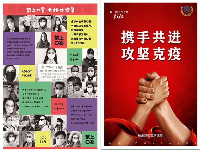 (左为新闻1601班何毅翔作品《口罩最美》 右为汉语1601班邓英楠作品《携手共进 共同克疫》 )