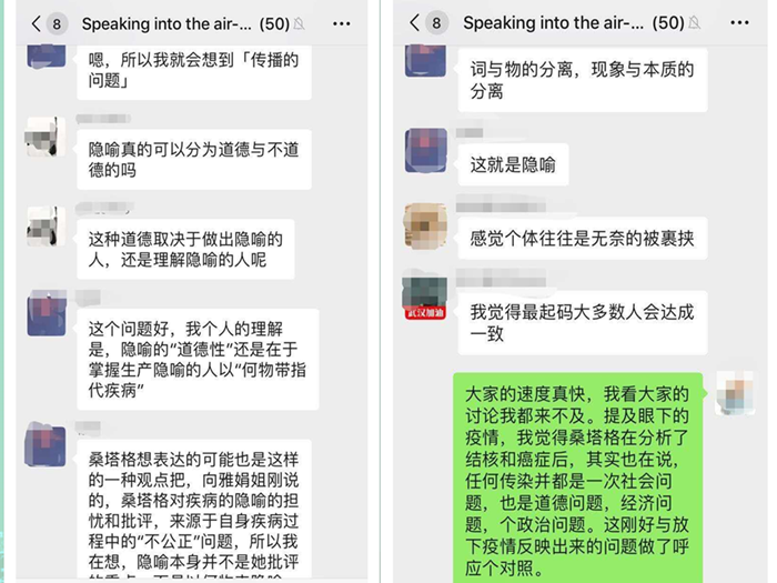 张雅娟博士是皇冠体育 新闻系的一名老师,为了让学生们用更加专业的眼光去看待和分析疫情,她带领2019级新闻与传播硕士,联合西安交通大学、上海大学、华东政法大学、中国传媒大学等高校的师生,共同组织开展了跨校联合网络读书会活动。在读书会中,各校老师先在微信群和微信公众号上做导读,随后同学们自行线下展开阅读。阅读的过程中,同学们还可以把自己的思考随时发到读书群里,进行提问、对话和交流。每周三晚9点,他们就当前所读书目和章节展开线上讨论,每次讨论都要持续几个小时,有时候甚至会到凌晨。会后,同学会将每次的讨论整理成文稿供大家再次阅读,重新思考。每次,他们的讨论成果都有万余字。截至目前,他们已阅读完《疾病的隐喻》一书,在读的有《我的凉山兄弟》、《交往在云端》《打造消费天堂》等。在关于《疾病的隐喻》这本书的讨论中,老师和同学们就疫情中的信息传播问题、对于死亡和生命的态度等问题展开了交流,希望能从语言学、社会学和传播学的角度分析疾病带来的社会影响。