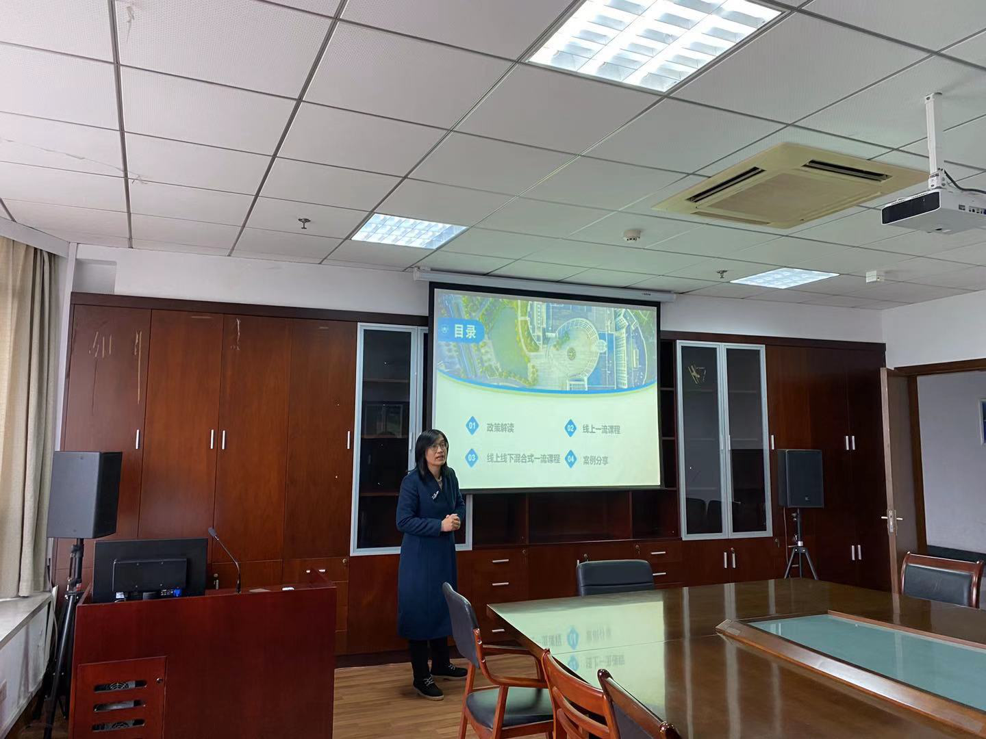 会议伊始,伍蓓副处长介绍了我校的一流课程建设情况,我校目前共有12门国家级一流课程,课程数量位于全国前100名,省属高校并列第一。伍处紧接着对教育部关于一流本科课程建设的实施意见等相关政策进行解读,指出线上线下混合式一流课程是基于慕课、专属在线课程(SPOC)或其他在线课程,运用适当的数字化教学工具,打造在线课程与本校课堂教学相融合的混合式“金课”,并大力倡导基于国家精品在线开放课程应用的线上线下混合式优质课程申报。