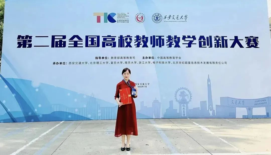 图为李蓉教授荣获全国高校教师教学创新大赛正高组二等奖、省赛特等奖