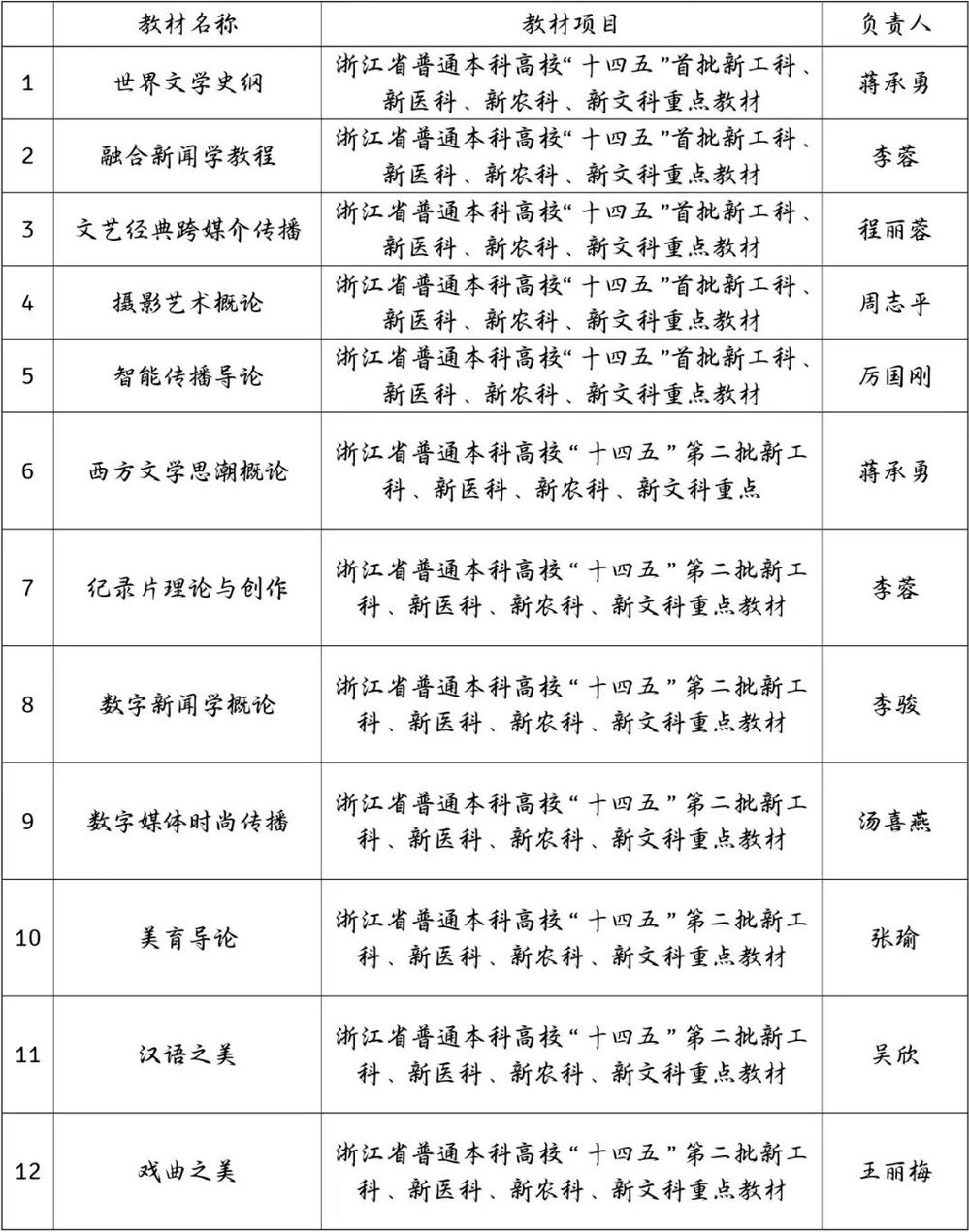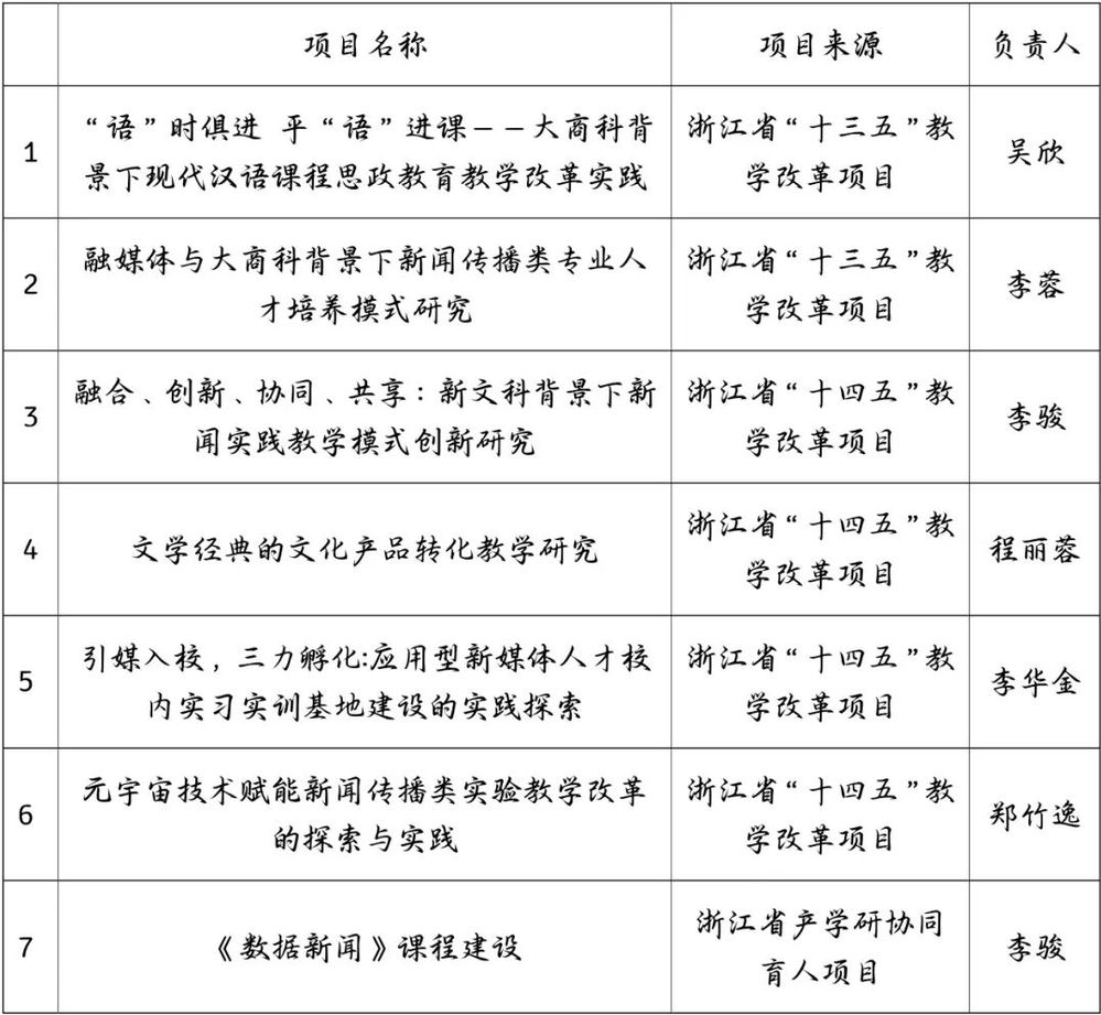 以精品教材建设为抓手,鼓励老师们与时俱进,编写新形态教材。学院策划了数字时代新闻传播系列前沿教程(7本)和中文前沿教材(5本)。学院共有12本教材获评浙江省“十四五”建设四新重点教材,共有7个项目获浙江省“十三五”、“十四五”的教学教改项目立项。