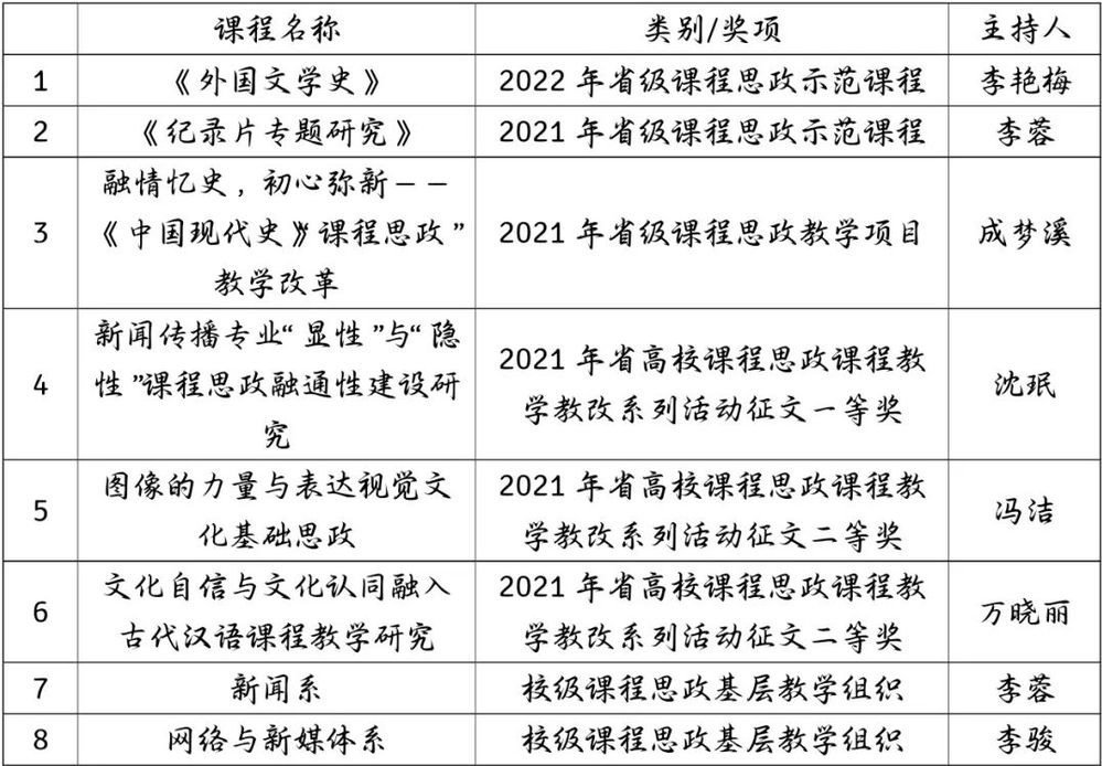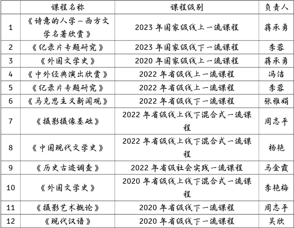 在一流课程建设上,全院共有12门课程获评一流课程。课程内容覆盖了全院五个专业,类型多、数量多、质量高。其中,《外国文学史》《纪录片专题研究》《诗意的人学—西方文学名著欣赏》3门课程获国家级一流课程认定。《摄影艺术概论》等9门课程获省级一流课程认定。